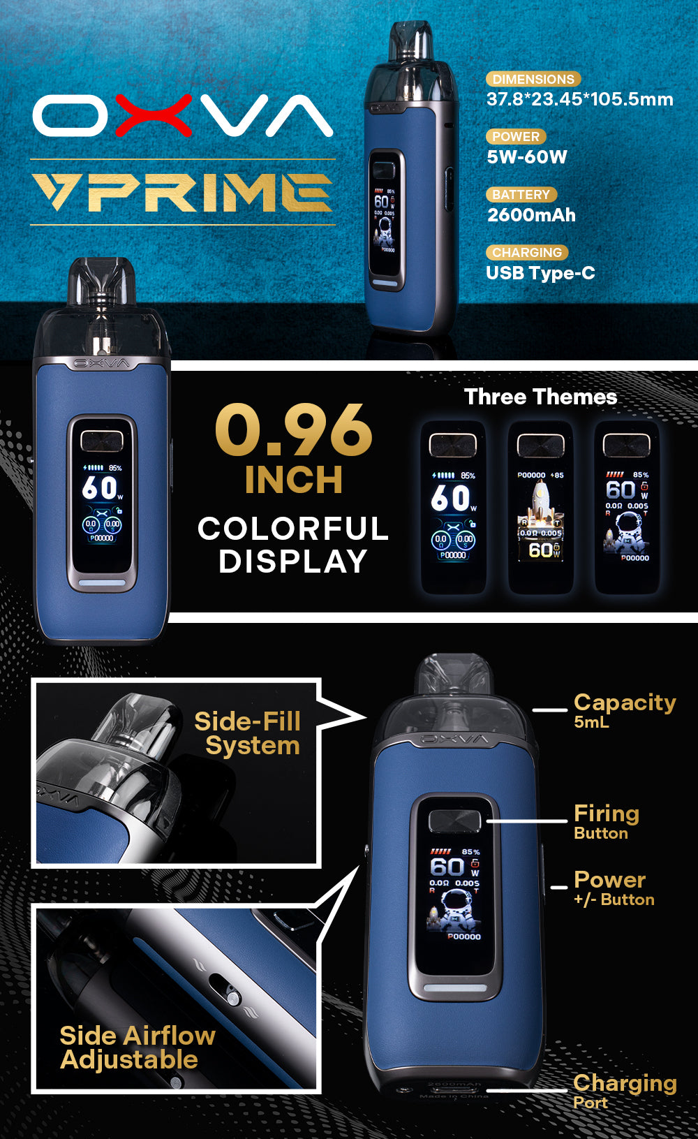 OXVA VPRIME 60W POD SYSTEM FEATURES: